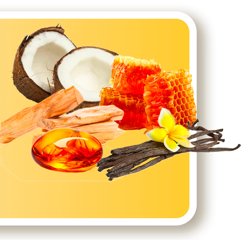 Cocco, Legno di Sandalo, Assoluta di Vaniglia di Thaiti, Legno di Cedro, Ambra, Legno di Guaiaco, Cera d’api